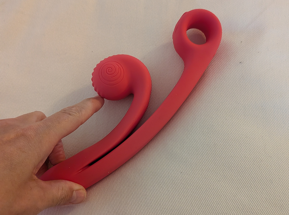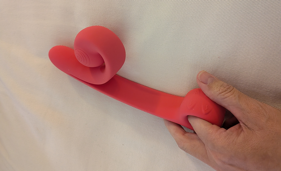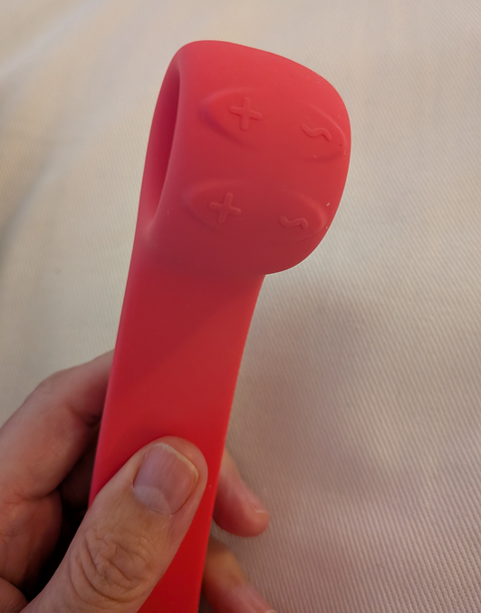 Det er det strukturelle design, der gør det interessant. Den buede, sneglelignende arm, der strækker sig mod klitoris, er stiv, men fjedrende på en måde, der gjorde mig nysgerrig efter at se, hvordan den ville opføre sig, når legetøjet var inde i mig. Håndtaget føltes dog uforholdsmæssigt langt. Jeg kunne straks se, at jeg skulle strække mig for at nå knapperne, som sidder tæt på en rund løkke, der er beregnet til at fastgøre en finger. Det ergonomiske valg var tydeligvis truffet med en anden armproportion i tankerne.